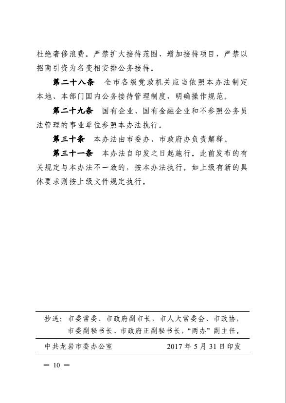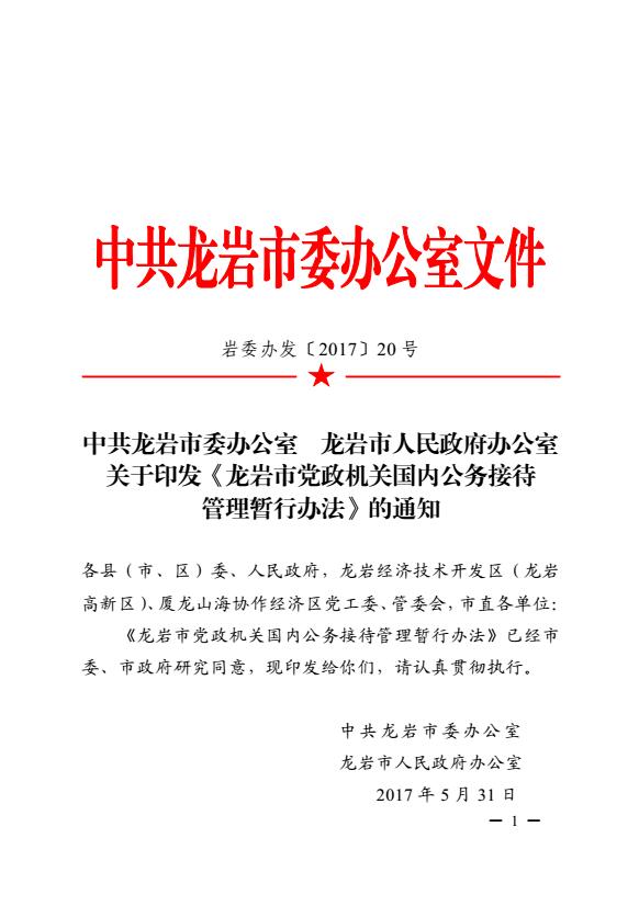 市委辦、市政府辦關(guān)于印發(fā)《龍巖市黨政機(jī)關(guān)國(guó)內(nèi)公務(wù)接待管理暫行辦法》的通知(巖委辦發(fā)【2017】20號(hào))