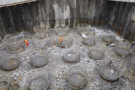 8月24日,繼龍巖大道高架橋主橋主塔樁基、承臺基坑開挖完成后項目已進入主塔承臺施工階段,主橋封底混凝土澆筑完成0.75米(共1.5米),主橋轉(zhuǎn)體關(guān)鍵設(shè)備鑄鋼球鉸已生產(chǎn)完成,現(xiàn)場正進行樁頭破除作業(yè)。由于連續(xù)橫跨贛龍鐵路、龍廈鐵路、羅龍東路、龍津河、雙洋路,主橋采用不對稱跨塔梁同時轉(zhuǎn)體施工,其轉(zhuǎn)體總重達2.366萬噸,轉(zhuǎn)體懸臂173.75m,施工難度巨大。為避免對城市道路及鐵路運行的影響,主橋?qū)⒉捎貌粚ΨQ跨塔梁施工并分二次轉(zhuǎn)體,下一步進行控制性工程為兩次主塔轉(zhuǎn)體施工。