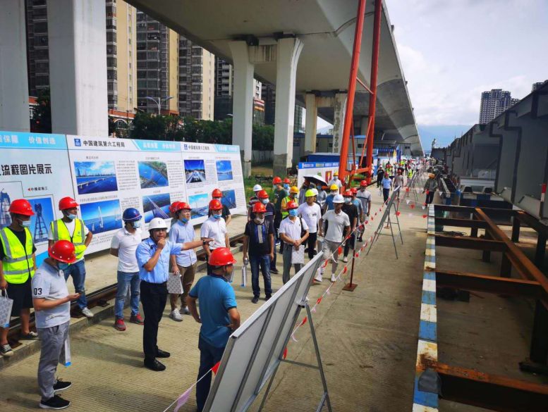 2020年6月28日,由龍巖城市發(fā)展集團(tuán)有限公司主辦,龍巖市政建設(shè)集團(tuán)有限公司(市城投公司)承辦,北京鐵研建設(shè)監(jiān)理有限公司、中國建筑第六工程局有限公司、中冶(上海)鋼結(jié)構(gòu)科技有限公司協(xié)辦的龍巖大道高架橋項(xiàng)目質(zhì)量安全標(biāo)準(zhǔn)化觀摩會在龍巖大道高架橋主橋鋼箱梁工程現(xiàn)場舉行。觀摩會分拼裝區(qū)域、提升站區(qū)域、頂推滑移區(qū)域、步履滑移區(qū)域及主橋轉(zhuǎn)體區(qū)域分別展示了龍巖大橋主橋鋼結(jié)構(gòu)拼裝、提升、弧形頂推滑移、步履滑移等新工藝及主塔“水平二次轉(zhuǎn)體”、鋼箱梁頂推、斜拉索施工技術(shù)。