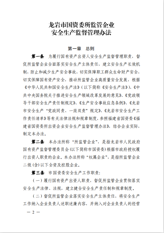 龍巖市國(guó)資委關(guān)于印發(fā)《龍巖市國(guó)資委所監(jiān)管企業(yè)安全生產(chǎn)監(jiān)督管理辦法》的通知(龍國(guó)資[2020]62號(hào))